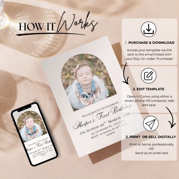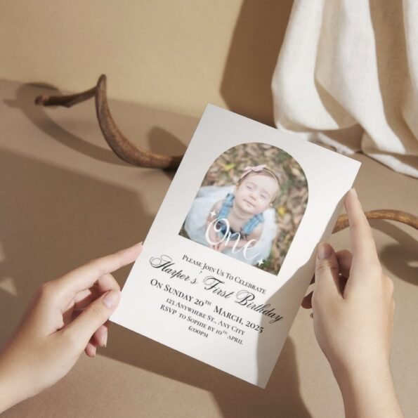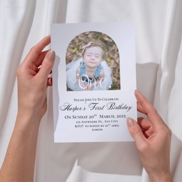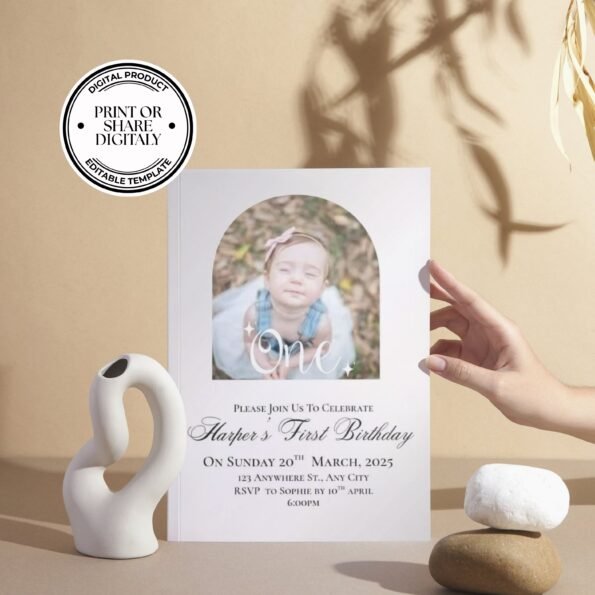 Celebrate your little one’s milestone with a beautiful, photo-ready digital invitation that’s fully editable and easy to personalize. This professionally designed template allows you to customize every detail and create a stunning invite that sets the tone for a joyful and memorable celebration. Print it at home or share instantly via text, email, or social media — your choice