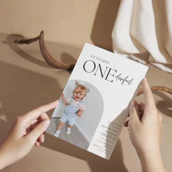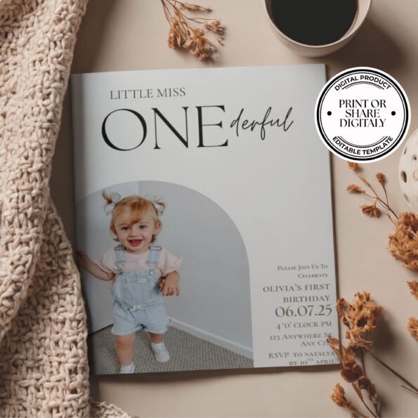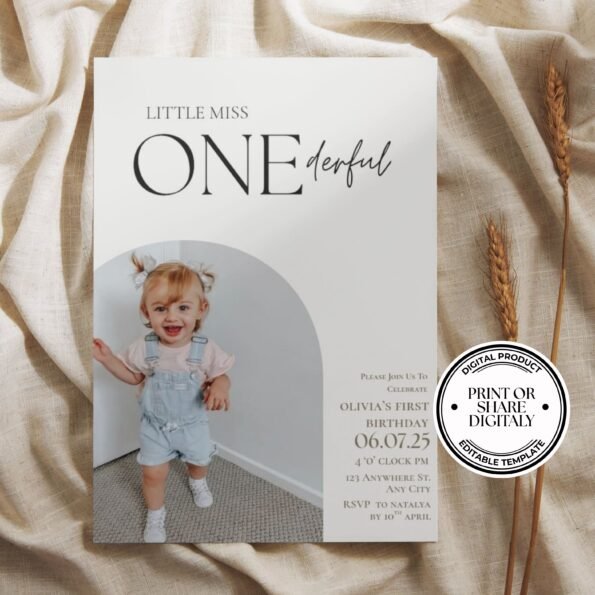 Editable Minimalist Boho First Birthday Invitation for Girls First Birthday with Picture