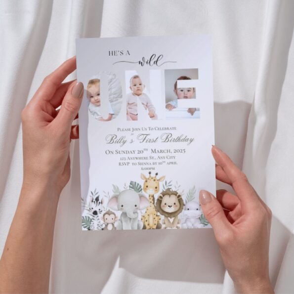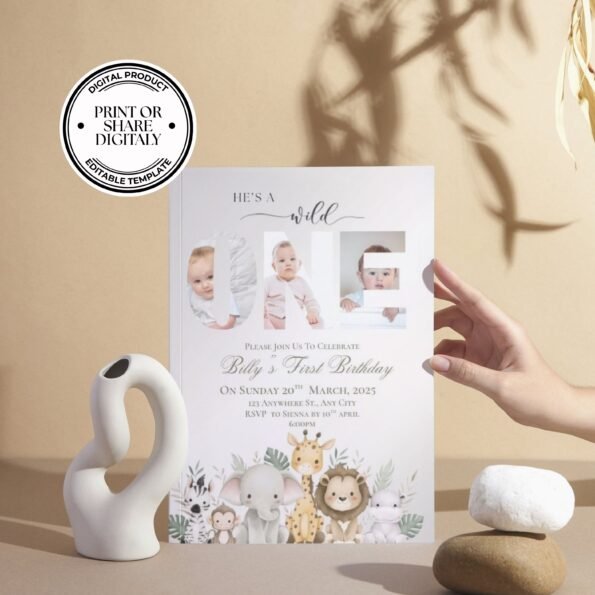 Make your little explorer’s first birthday unforgettable with this adorable safari-themed digital invitation. Designed for busy parents, this easy-to-edit template lets you personalize photos, wording, and colors in minutes — no design experience needed. Whether printed or sent digitally, this invite sets the perfect mood for a fun-filled jungle celebration.